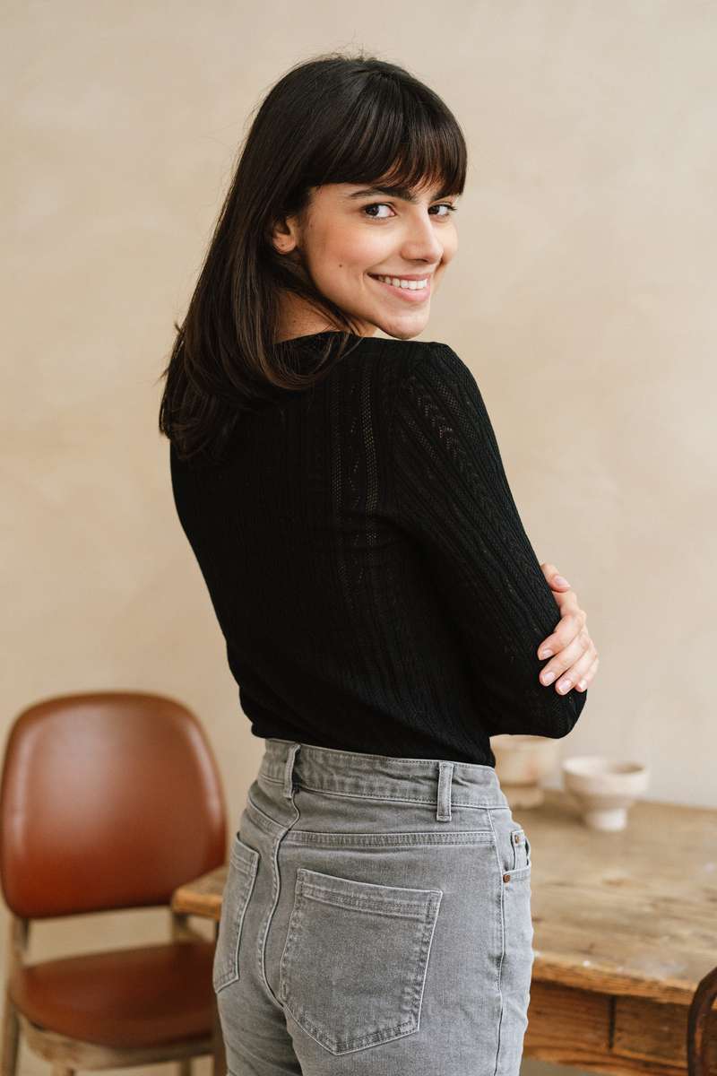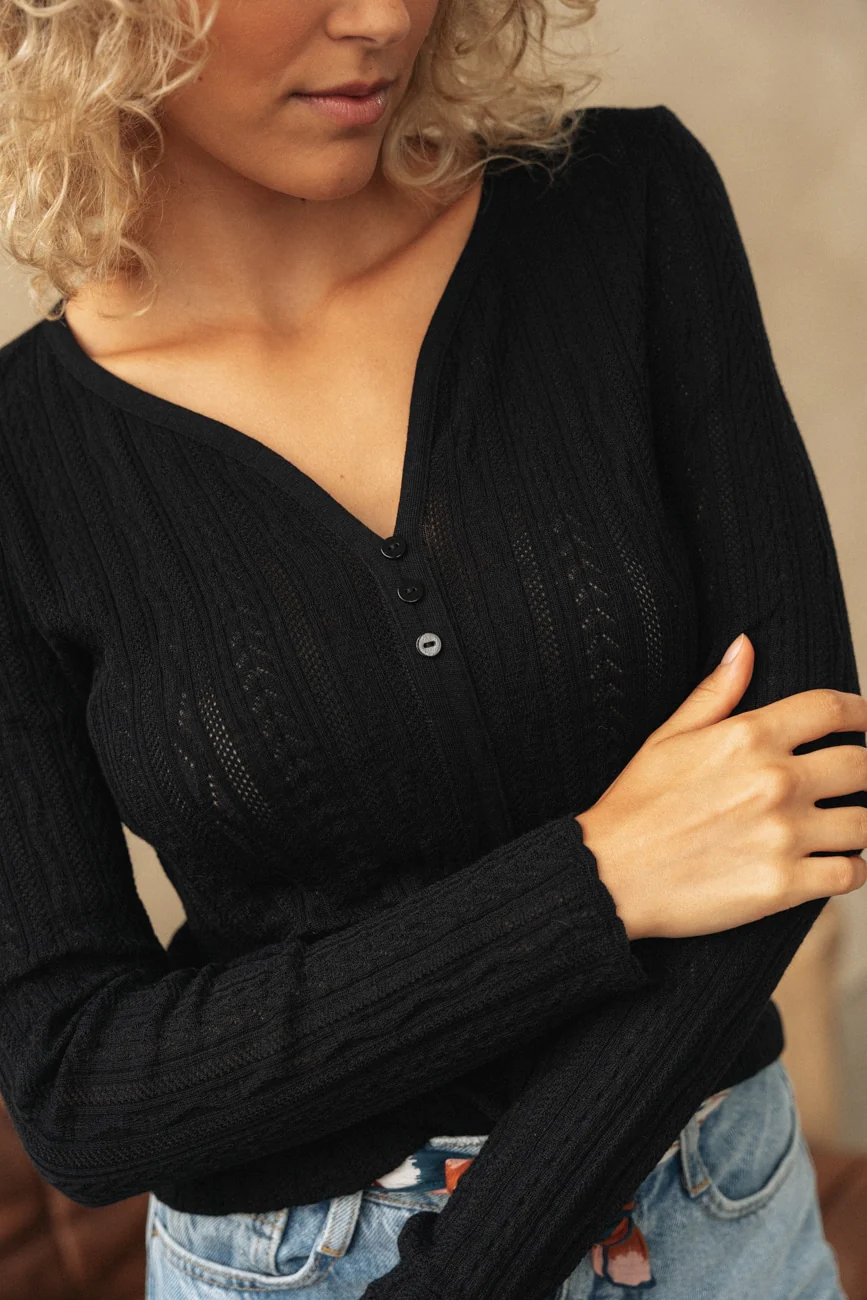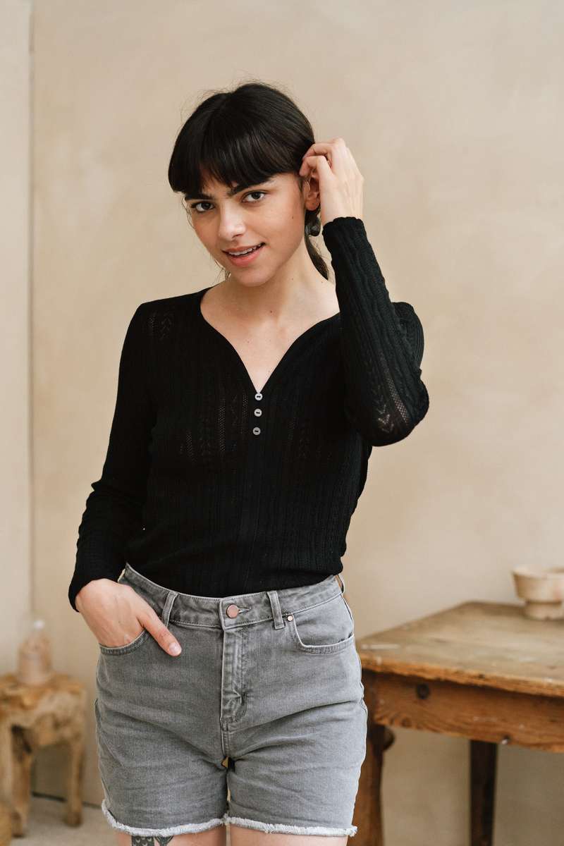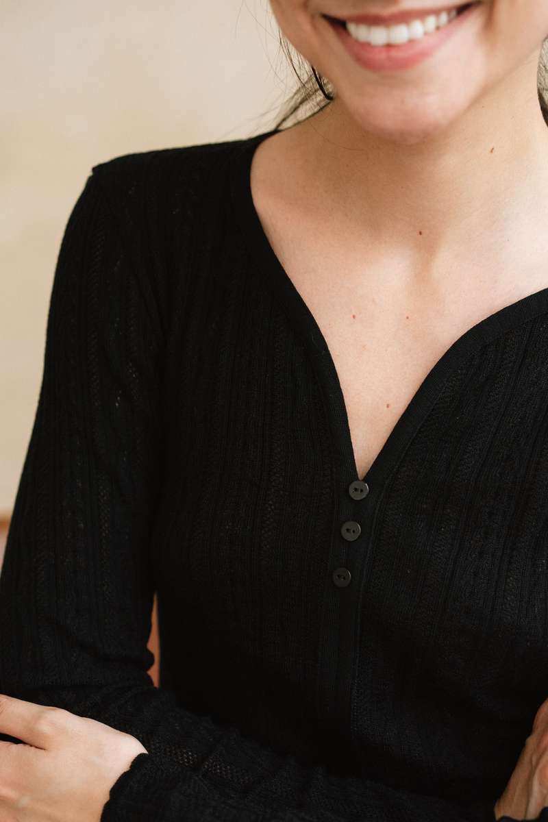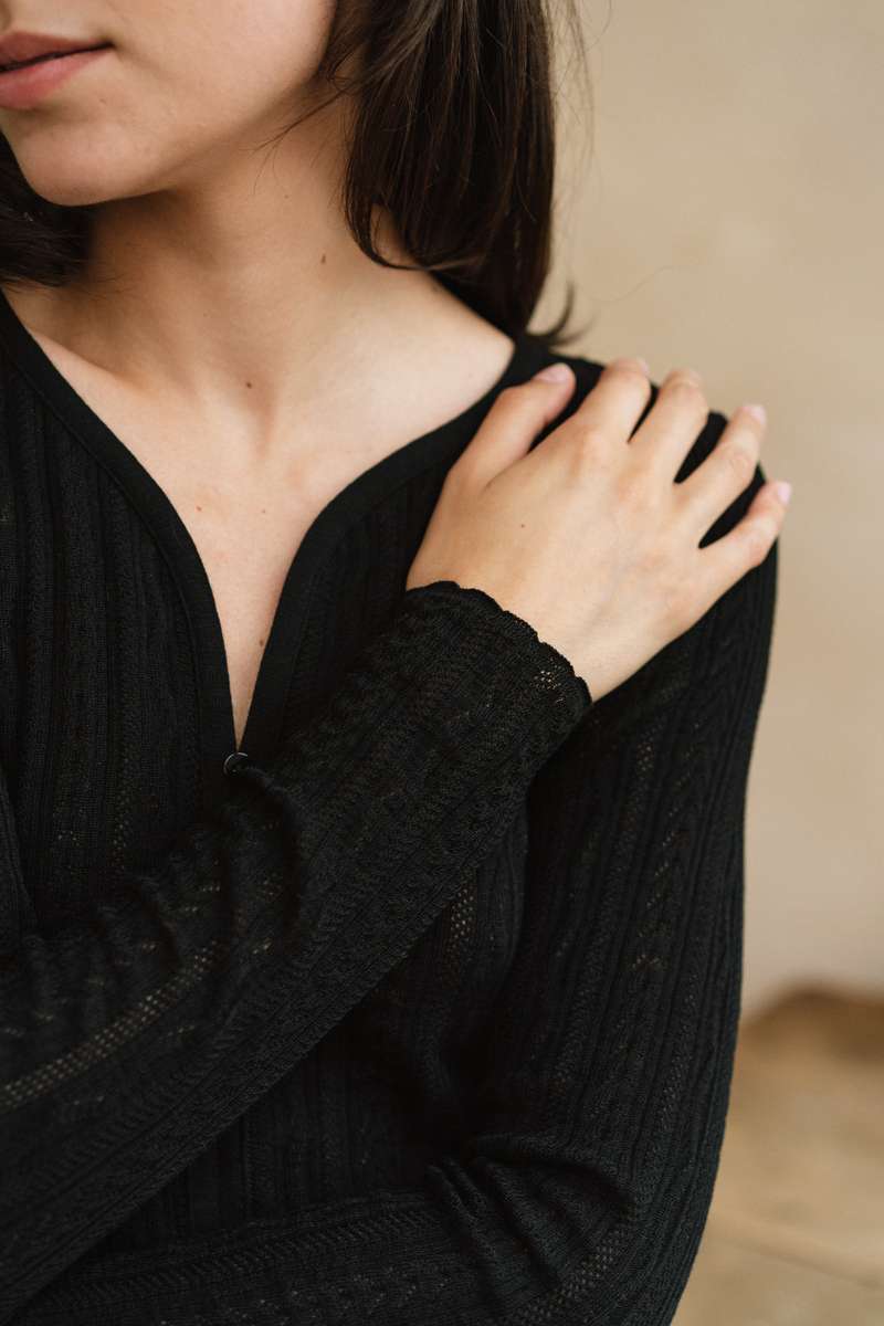 Fancy knitting for our mock cardigan with heart-shaped neckline. Ultra soft and comfortable, Robin is delicate and feminine.