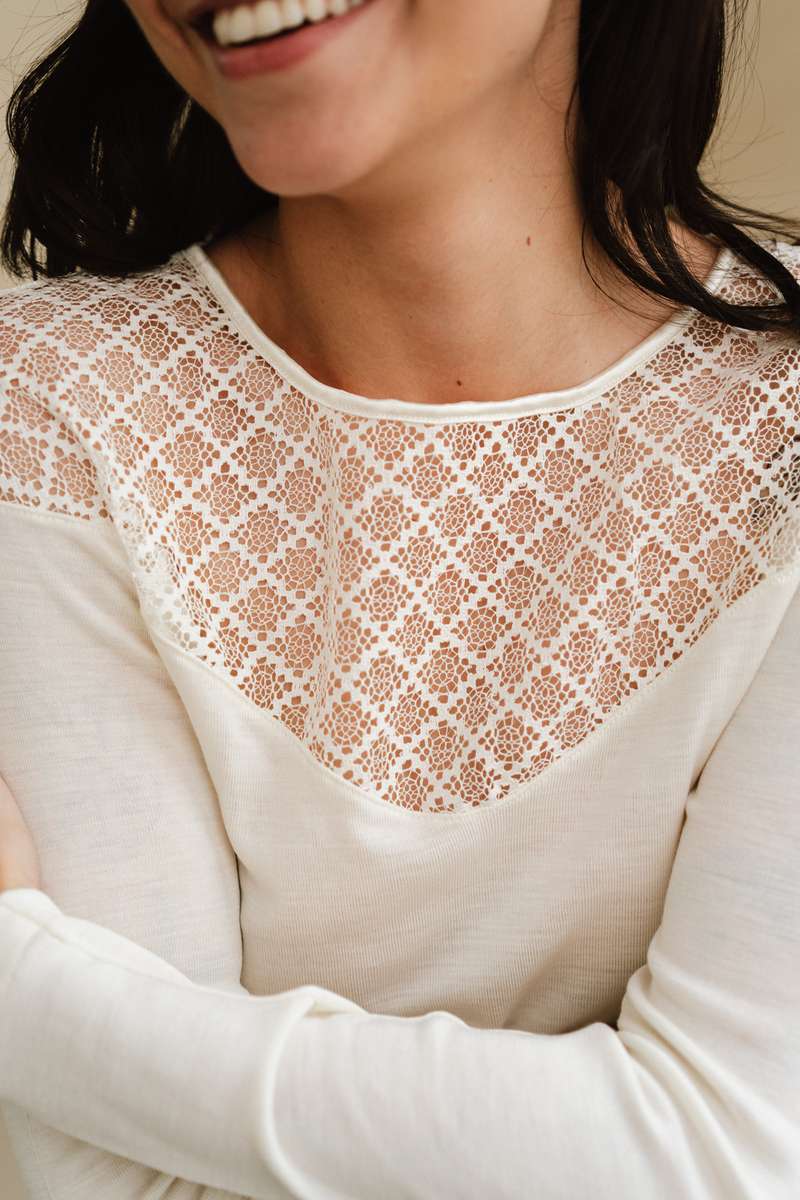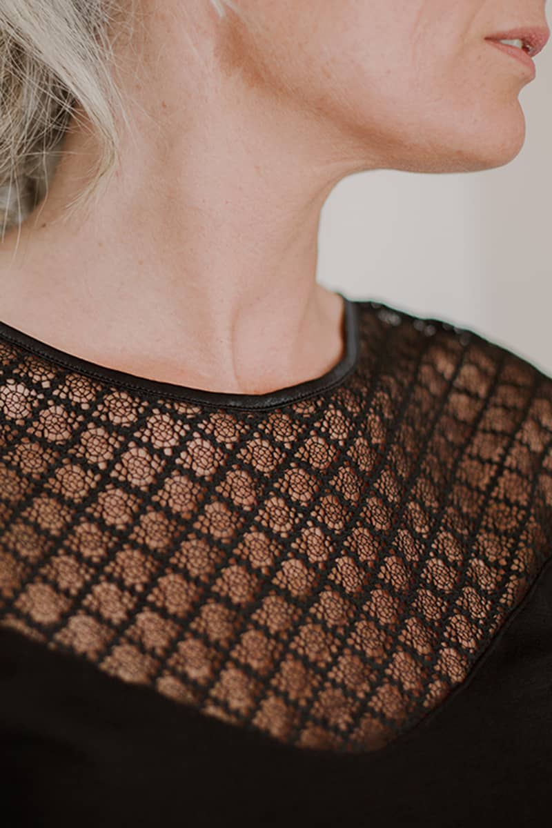 • Graphic lace of Calais that dresses the neckline and the shoulders