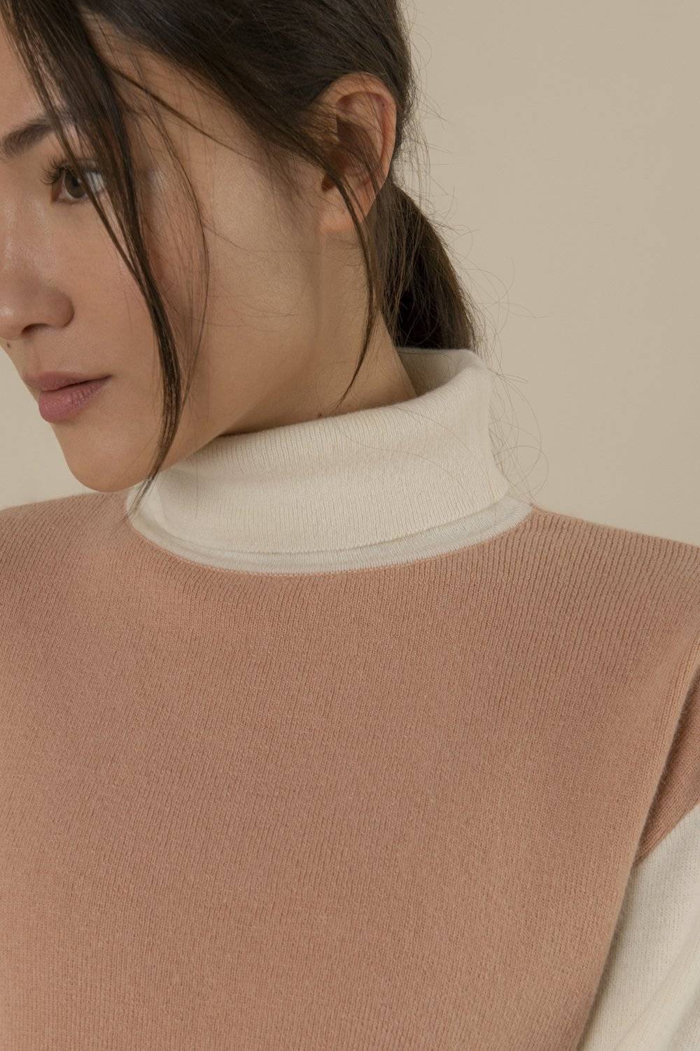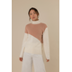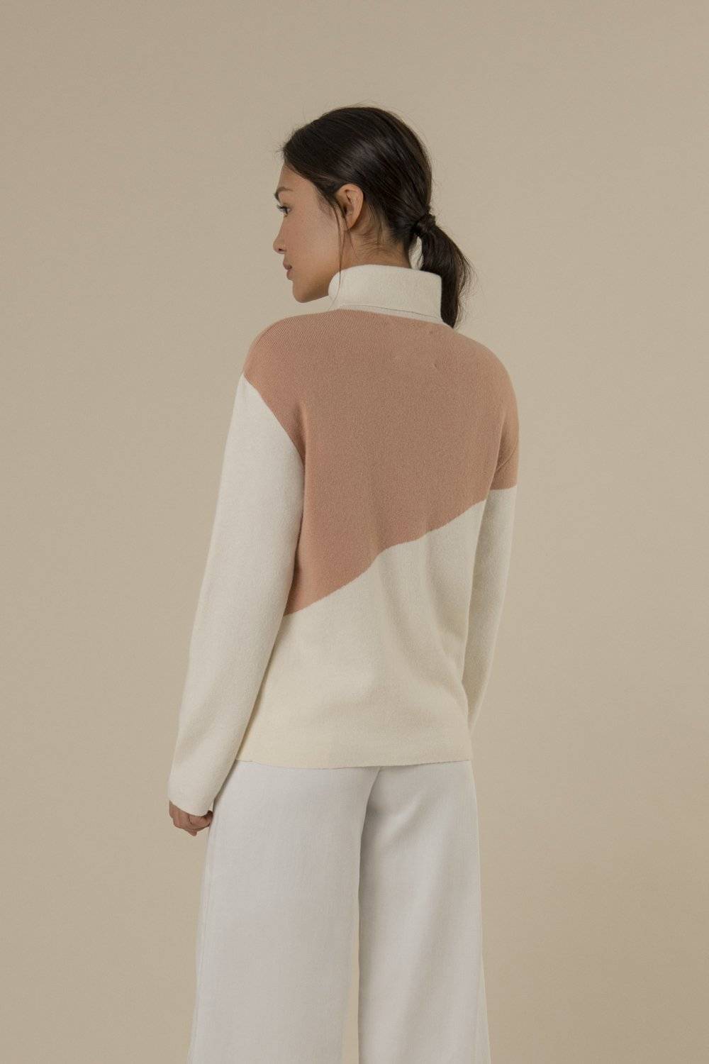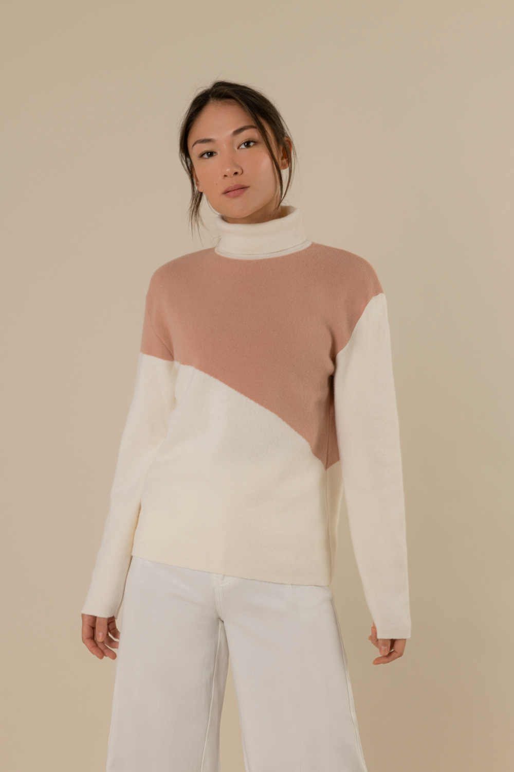 Wool and angora blend sweater with distinctive rollneck and an elegant diagonal colour change from rusty rose to white across the chest. The dense knit makes this piece compact and very warm, perfect for facing the harsh environment of cold Winter days.