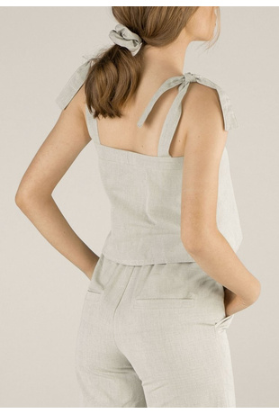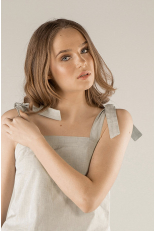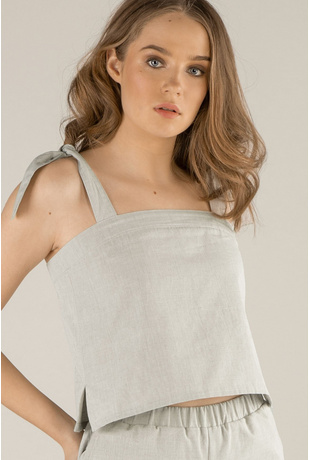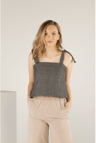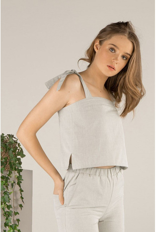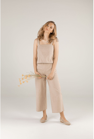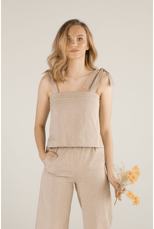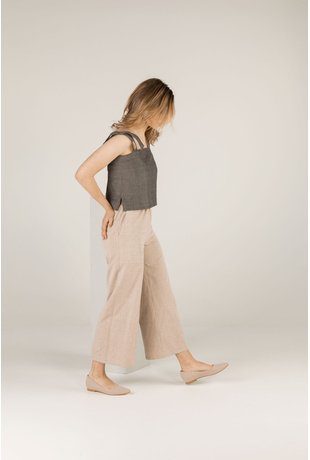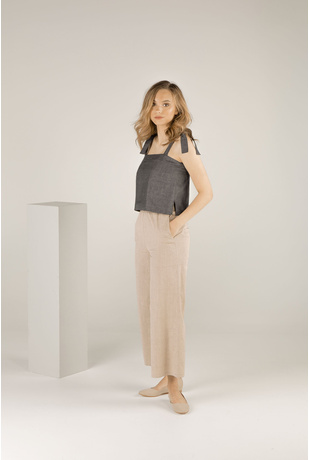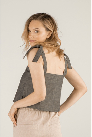 The Free Spirit top is an easy-going little crop top. It has a straight shape and slits on the sides of the hem. Featuring a top stitched bust strap and shoulder straps that you can tie according to your liking. Wear separately or as a set with our Forest Whispers Culottes! Made from a charming handmade organic cotton fabric with character and a lively surface.