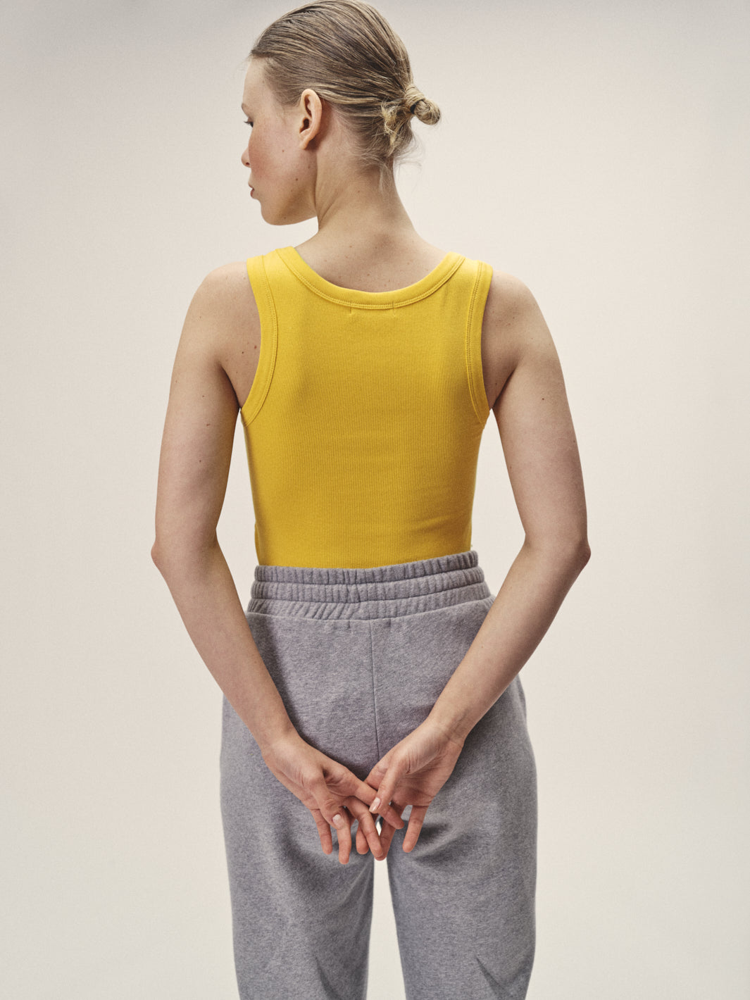 Description: Our basic tank top in finely ribbed, soft organic cotton has a classic yet timeless fit. It has a rounded carre neckline at the front and a slight racerback shape at the back. Cool as an undershirt or worn separately in summer. The elastane content ensures a very good fit.