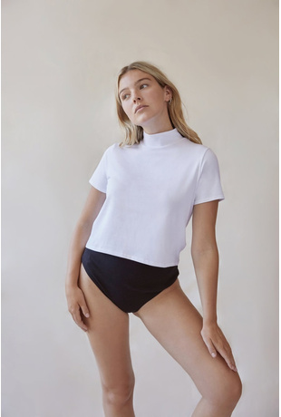 Our slightly cropped THE SARA, with its soft and organic feel, comes in a fresh and earthy color palette. It features a beautiful mock neckline and pairs seamlessly with your Levi’s.