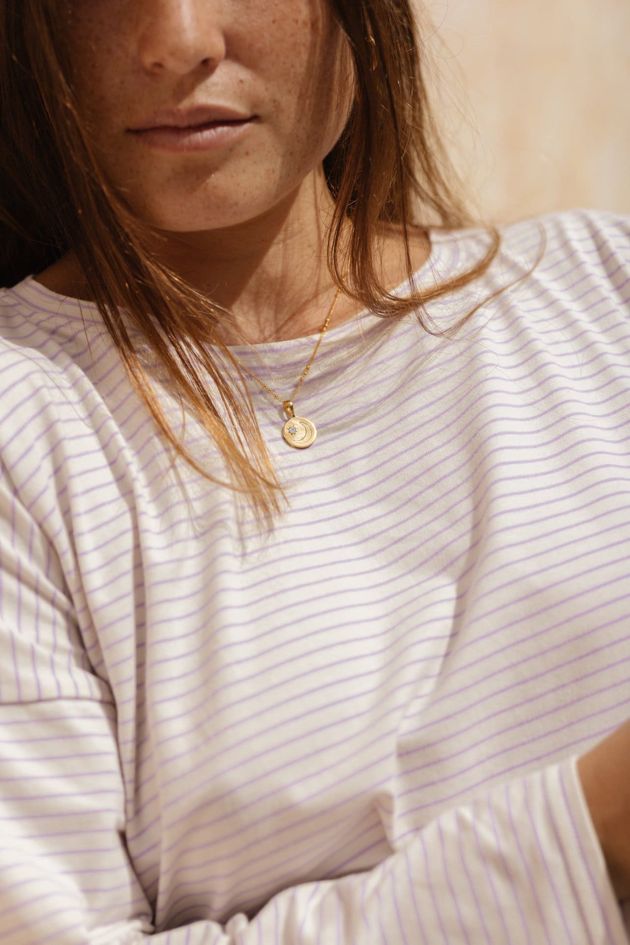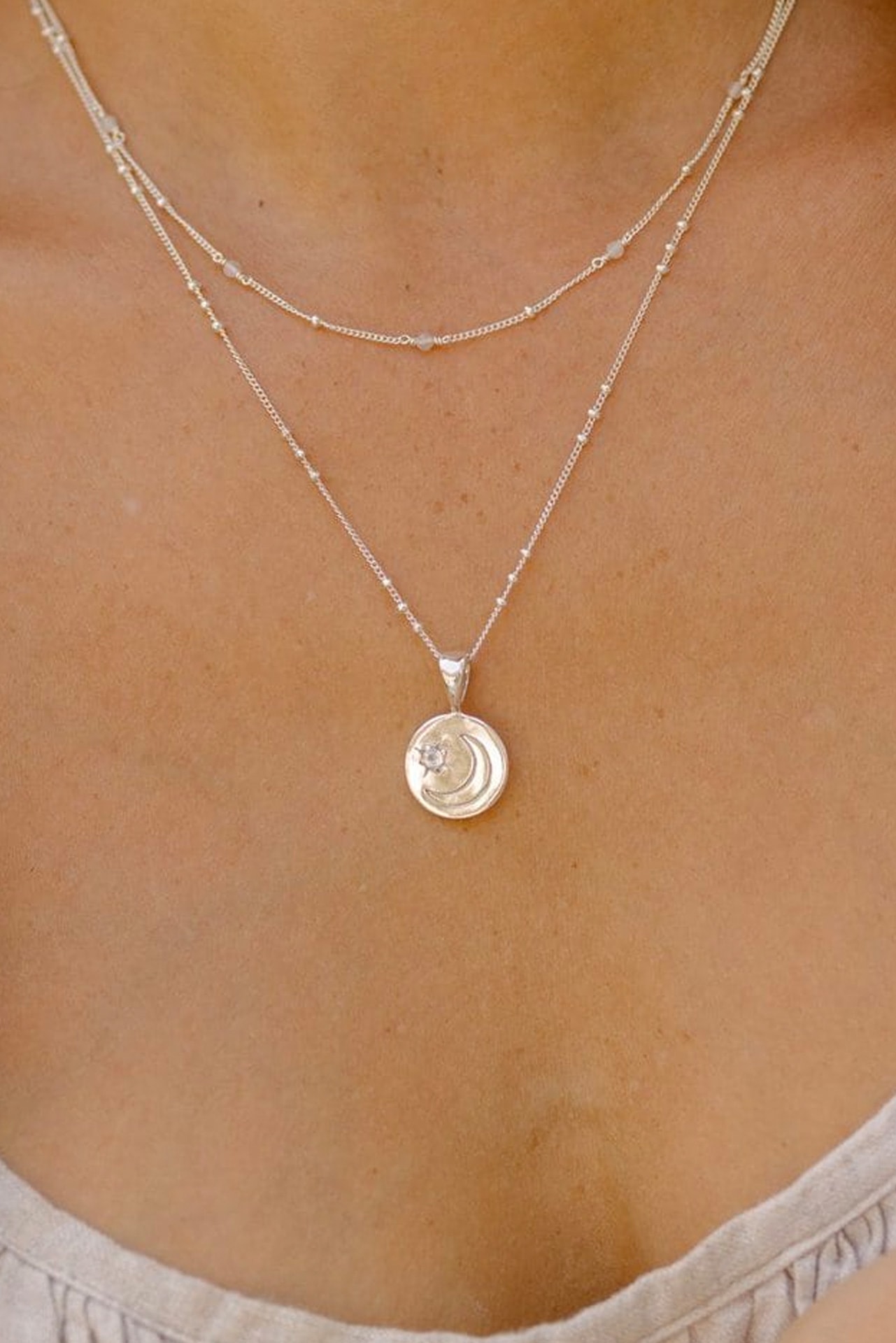 The celestial pendant is a lovely piece, featuring an engraved moon and a complementary Moonstone. Together, they create a captivating piece of jewelry that embodies the beauty of the cosmos.