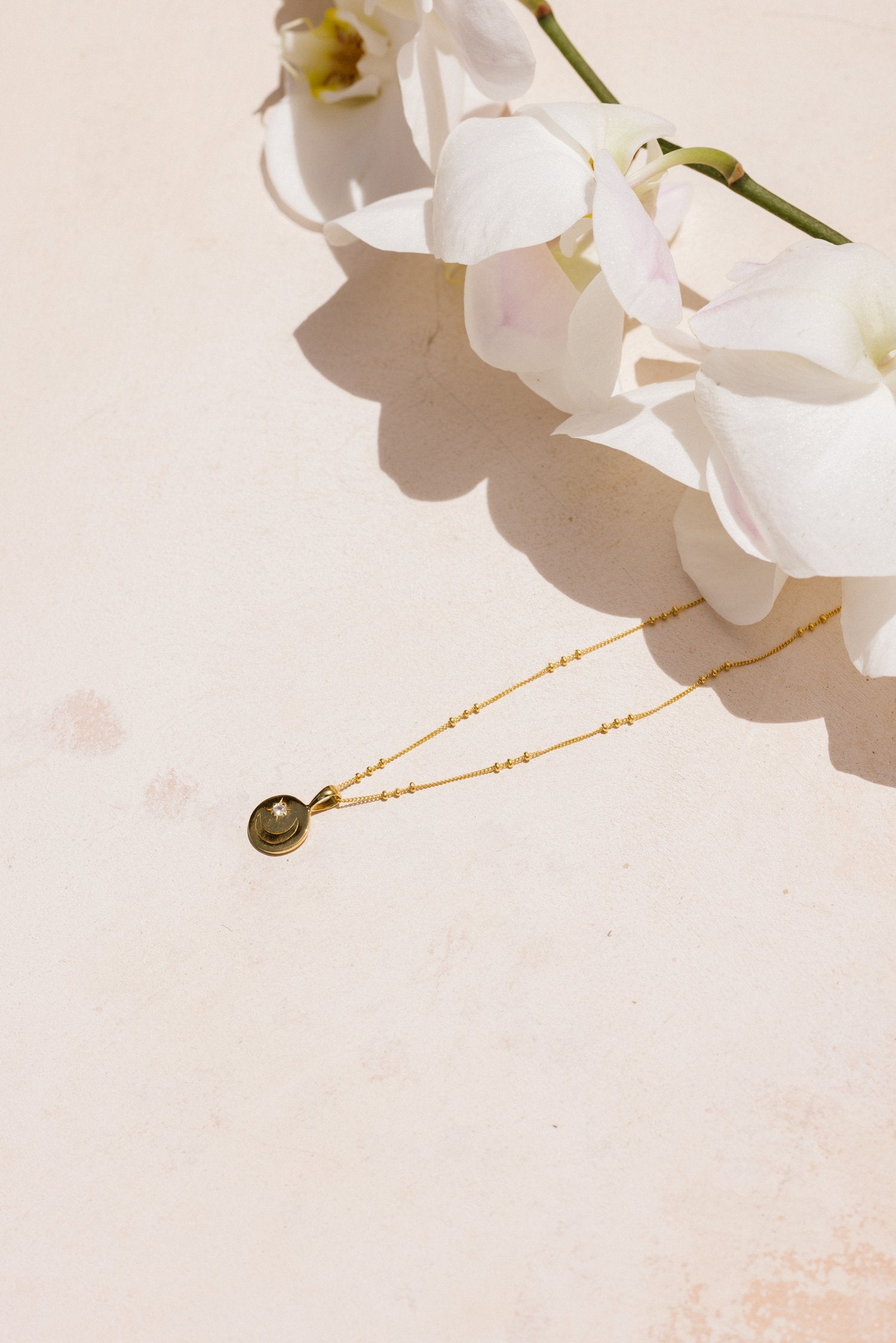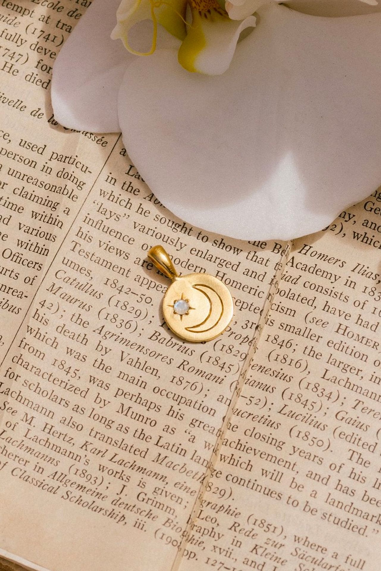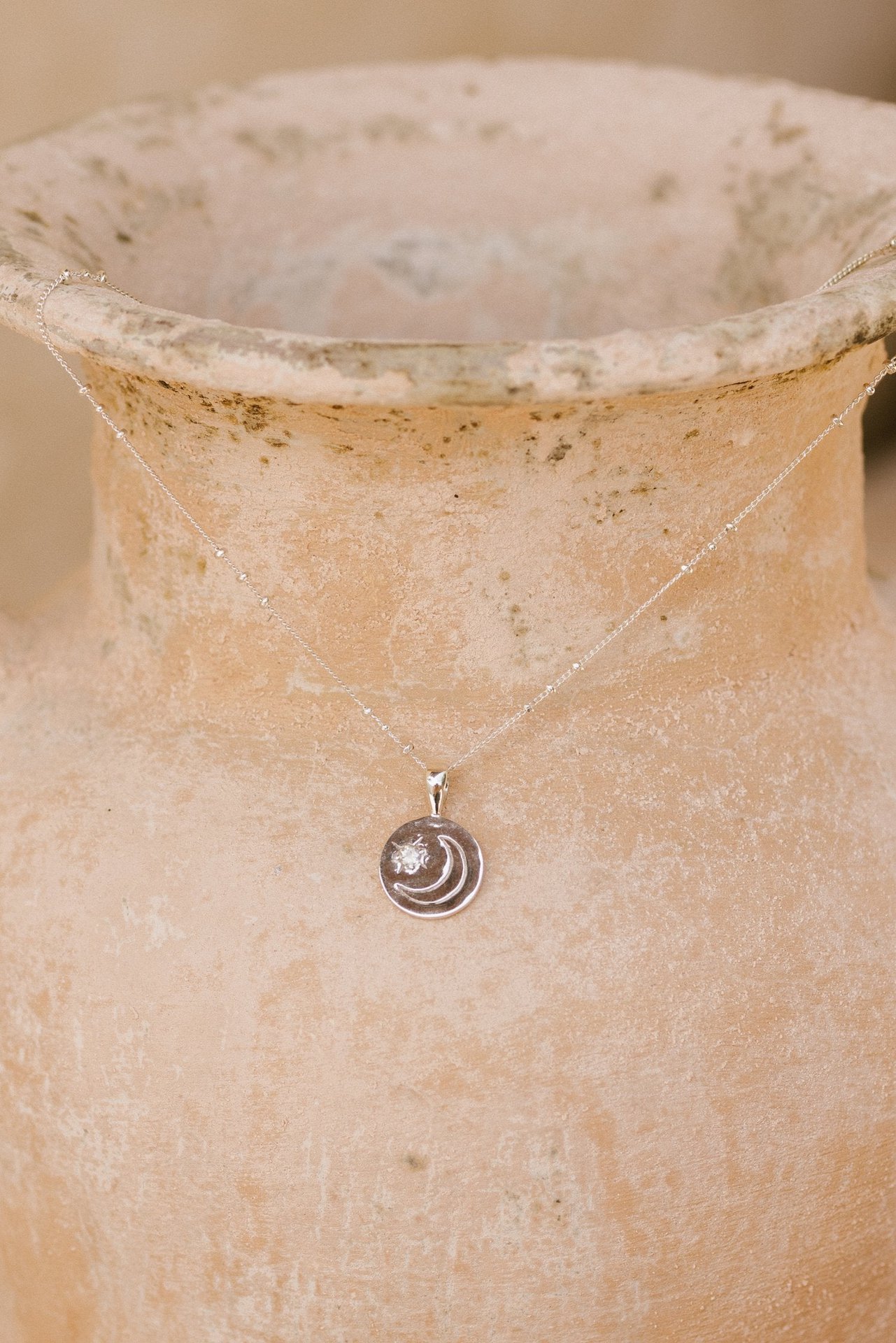 The celestial pendant is a lovely piece, featuring an engraved moon and a complementary Moonstone. Together, they create a captivating piece of jewelry that embodies the beauty of the cosmos.