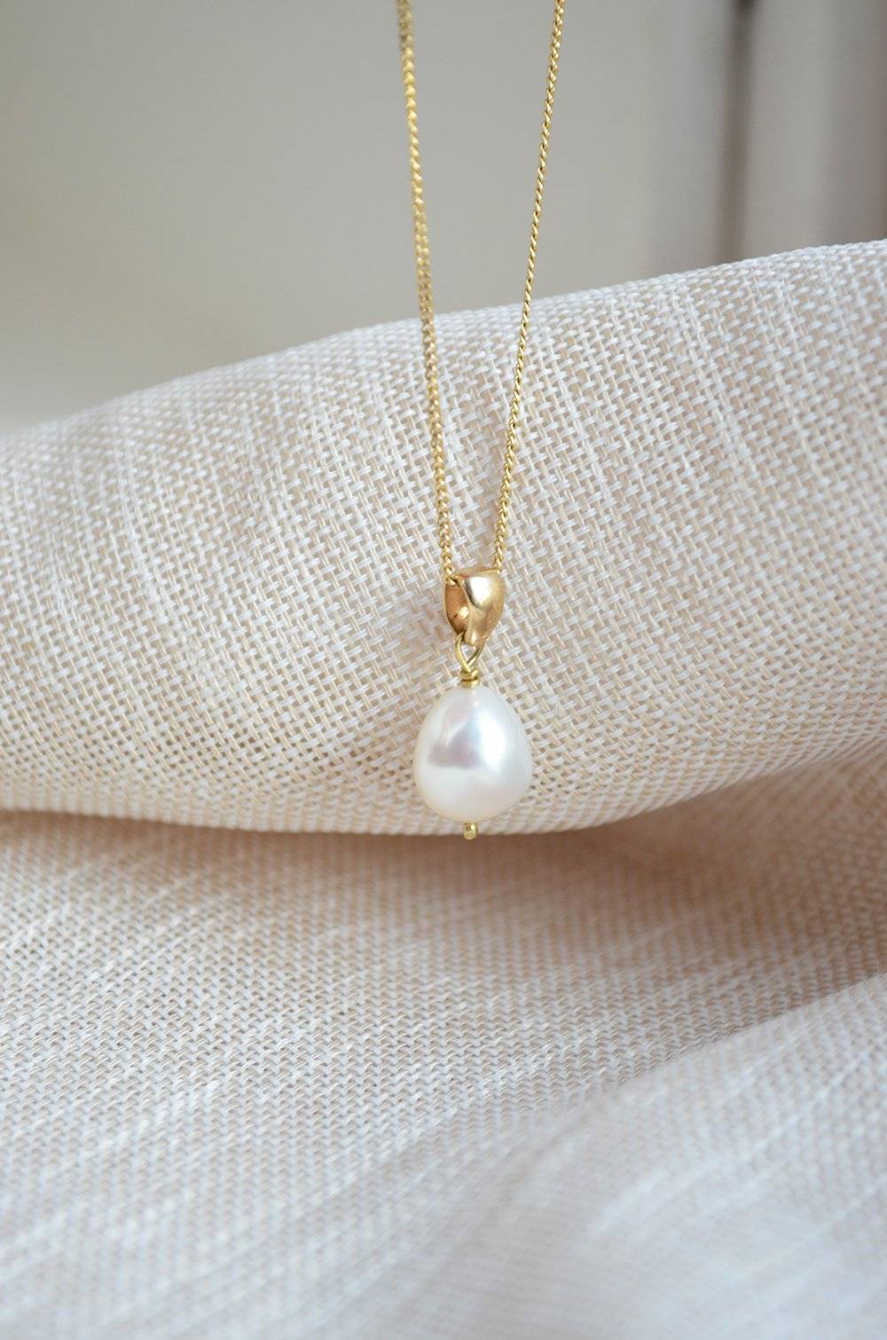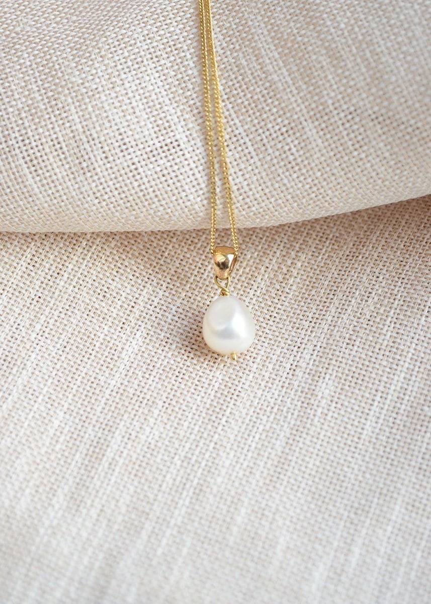 The Pearl necklace consists of a 14K gold necklace with a freshwater pearl wrapped in 14K gold. We use recycled gold and each item is designed & handmade by us at our atelier in Amsterdam.