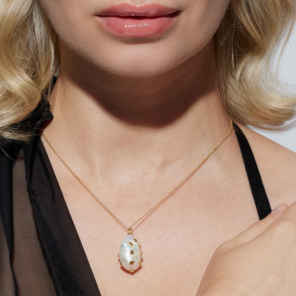 The Venus gold chain necklace showcases a large vintage Keshi pearl with tiny gold chips called barnacles. This elegant sustainable necklace features a unique shaped pearl, so no two are the same.