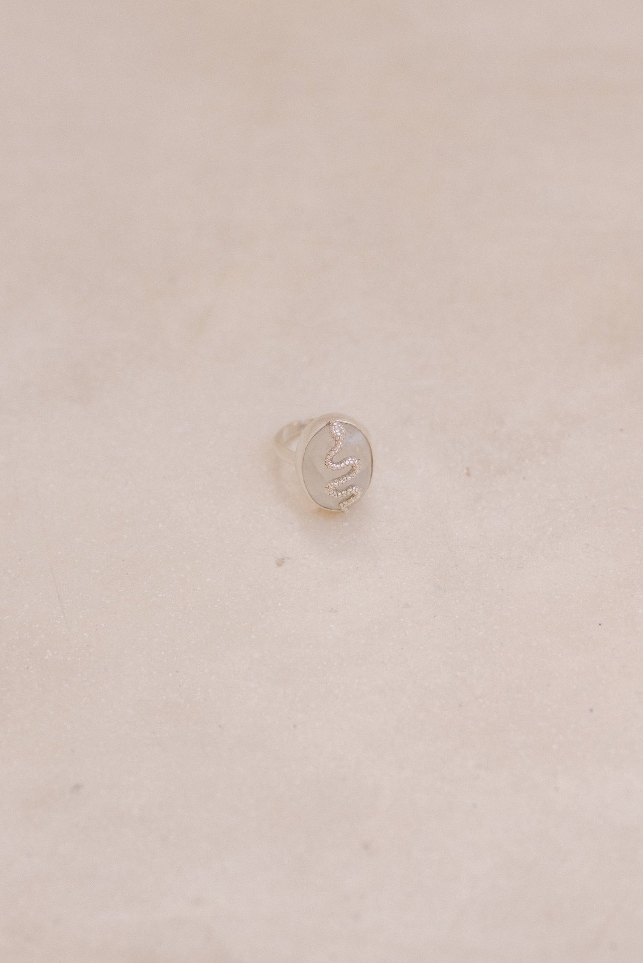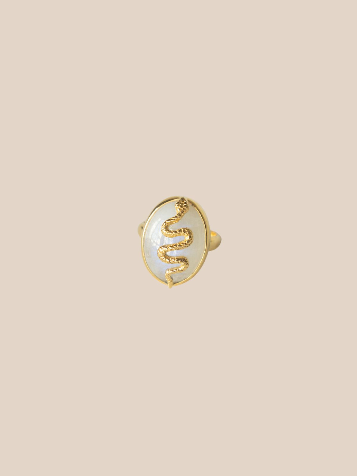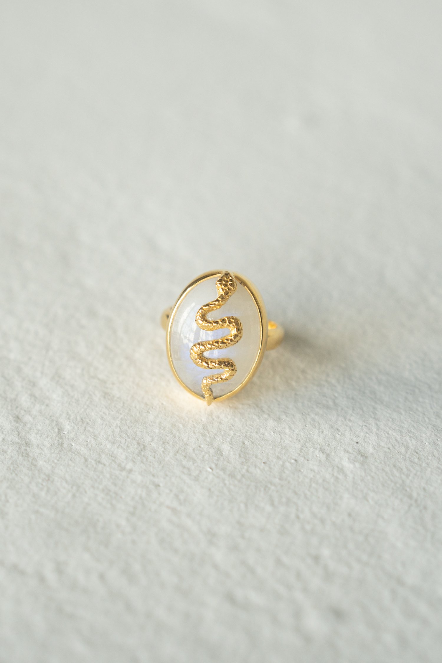 The Kundalini Ring is a talisman of divine feminine energy and spiritual awakening. Featuring a large semi-precious moonstone, cut in a beautiful oval shape and embellished with the Kundalini snake motif, this powerful ring will lift your energy and awaken your mind body connection.