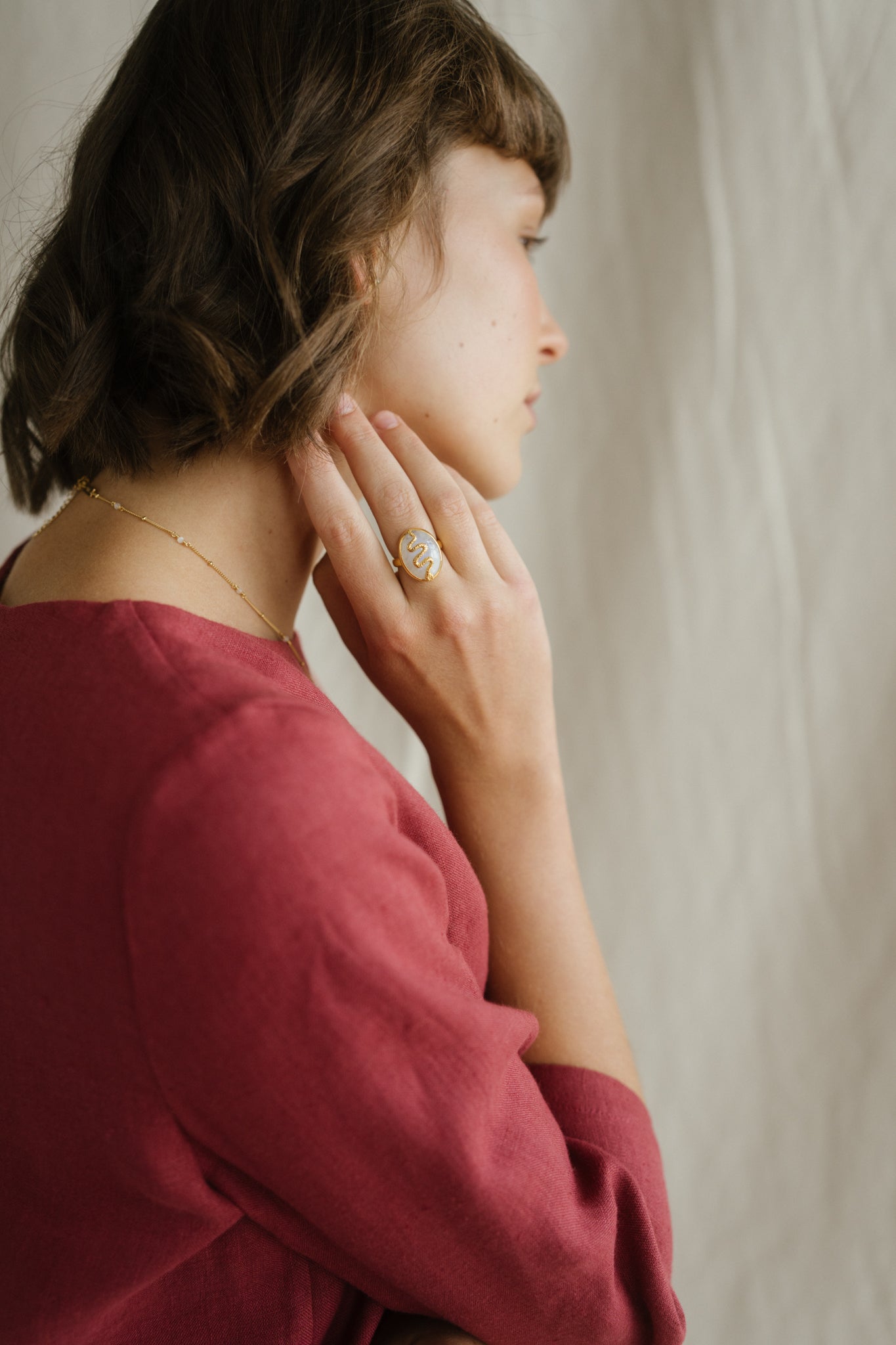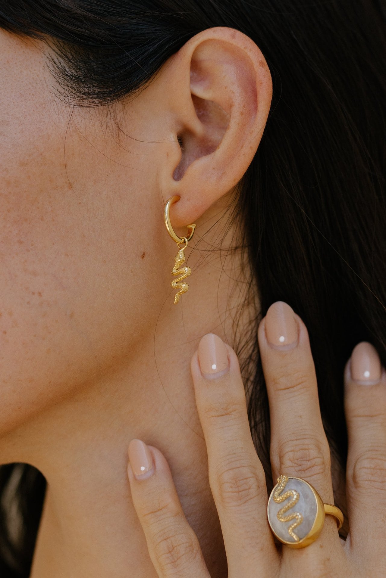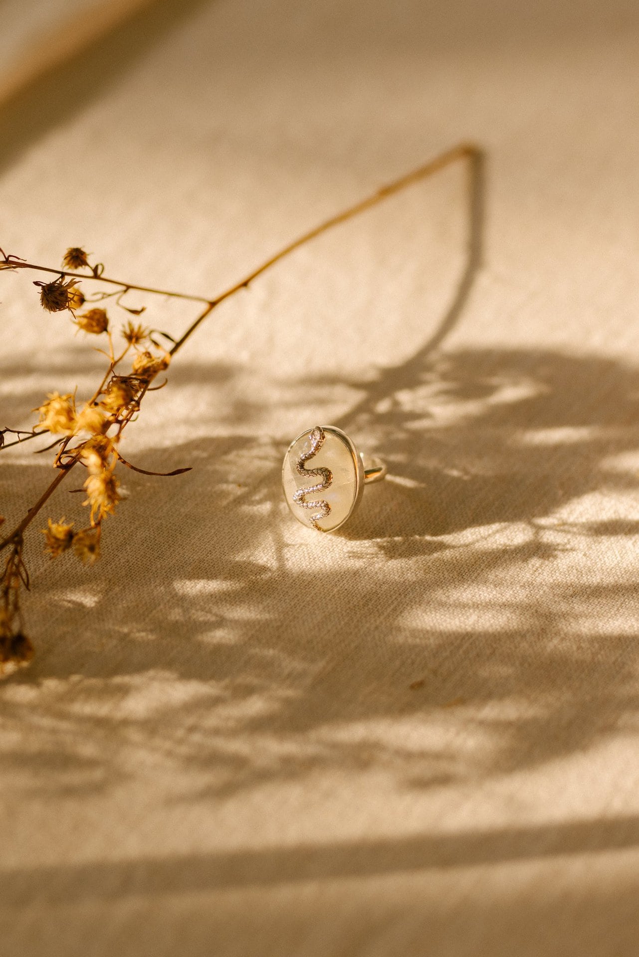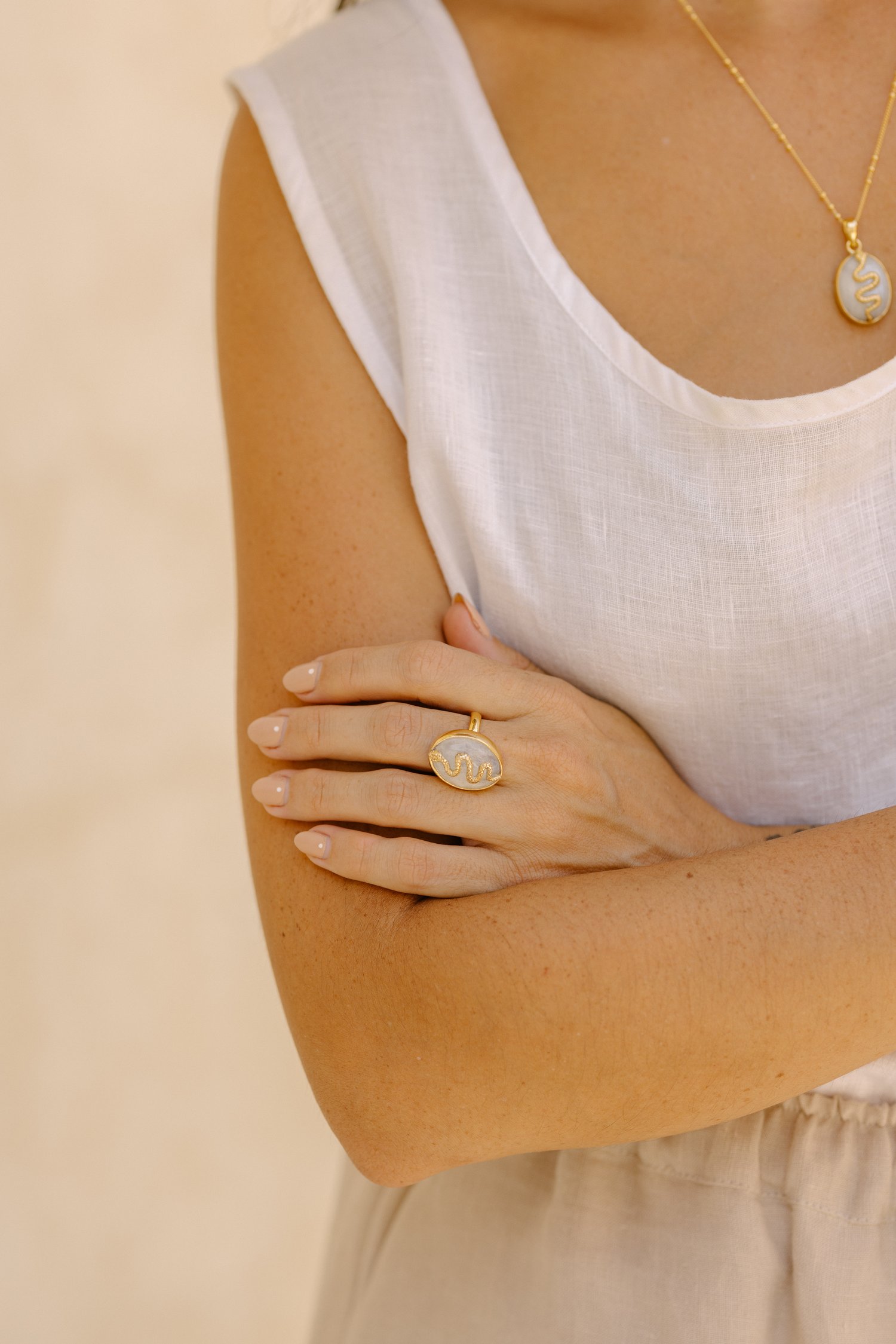 The Kundalini Ring is a talisman of divine feminine energy and spiritual awakening. Featuring a large semi-precious moonstone, cut in a beautiful oval shape and embellished with the Kundalini snake motif, this powerful ring will lift your energy and awaken your mind body connection.