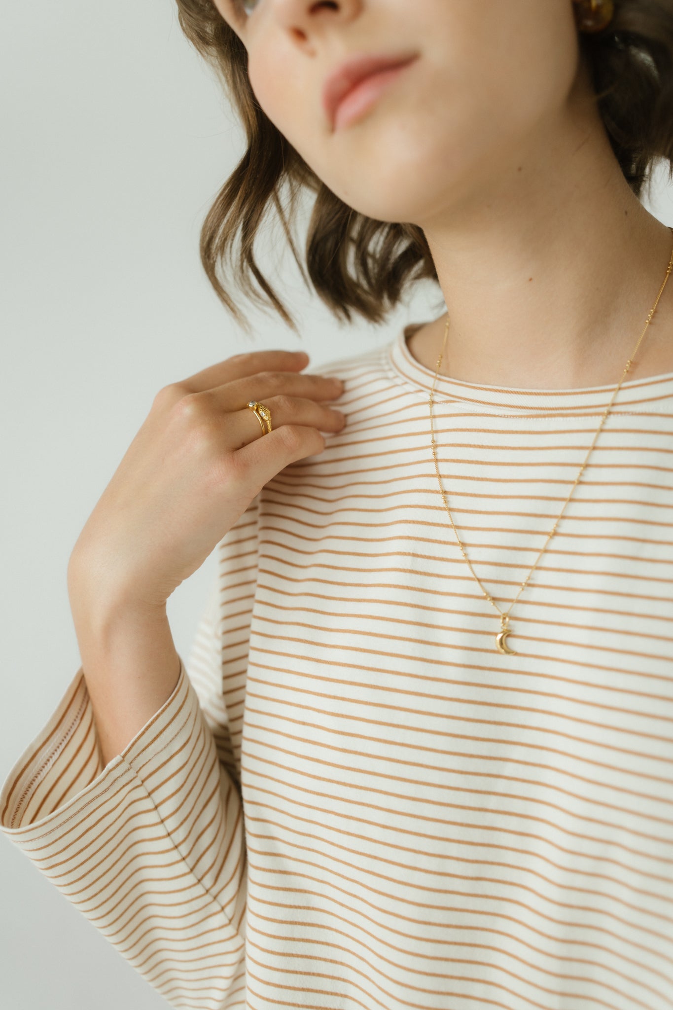 Since this past Spring, sun+her assortment has grown with the addition of beautiful jewelry. Handcrafted in Bali, made from Sterling Silver 925 and plated in 18k gold in Switzerland, their jewelry is inspired by the cosmos, featuring beloved jewelry staple silhouettes accompanied by crescent moon motifs, semi-precious moon stones, and genuine rice pearls.