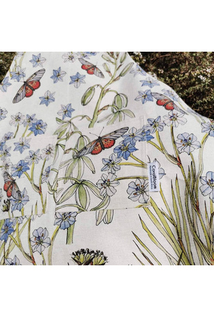 Textiles are digitally printed with eco-friendly water-based ink on durable and absorbent hemp-cotton (60-40) textiles. Each item is lovingly made by hand with mitered corners, colour-coded hemp ties and 2 pockets pocket, ideal to hold a cellphone or utensils.