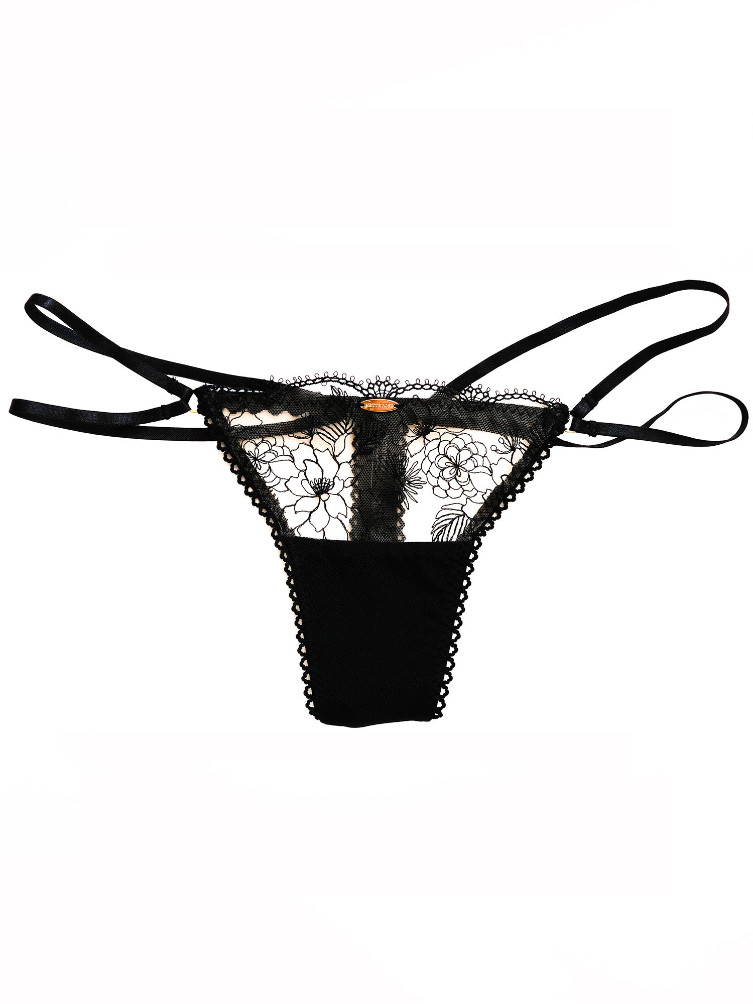Classic string knicker made with beautiful embroidered lace paired with a soft cotton gusset and double side straps ~ adorned with the signature Nette Rose tag.
