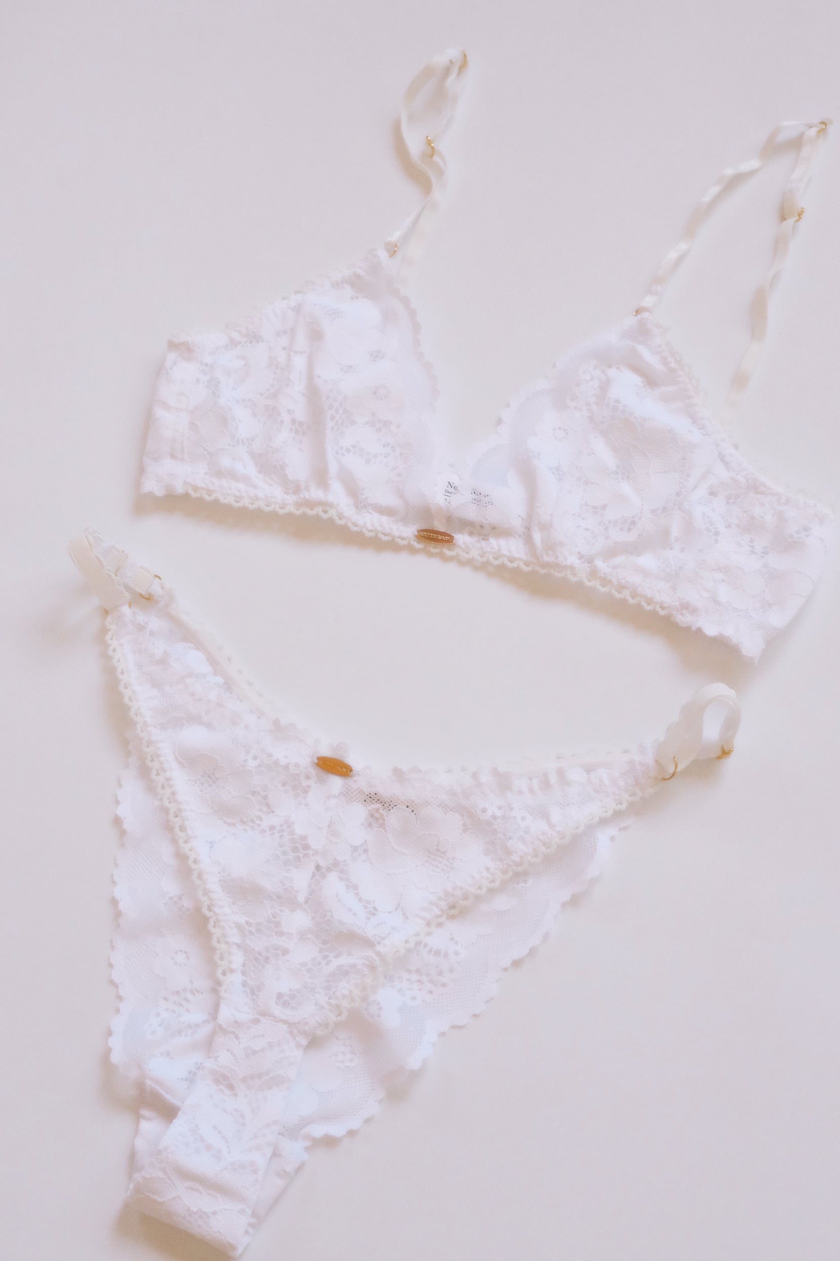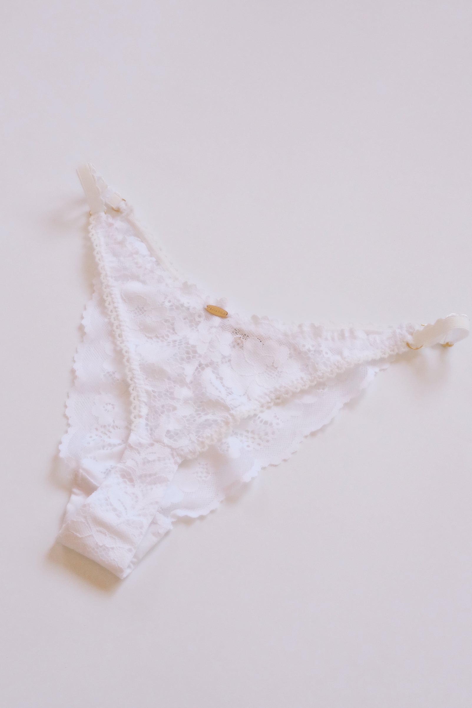 Our honey, Ellie is made with soft white floral stretch lace, paired with a cheeky back and finished with the signature Nette Rose tag. Adjustable side straps to move and groove with you.