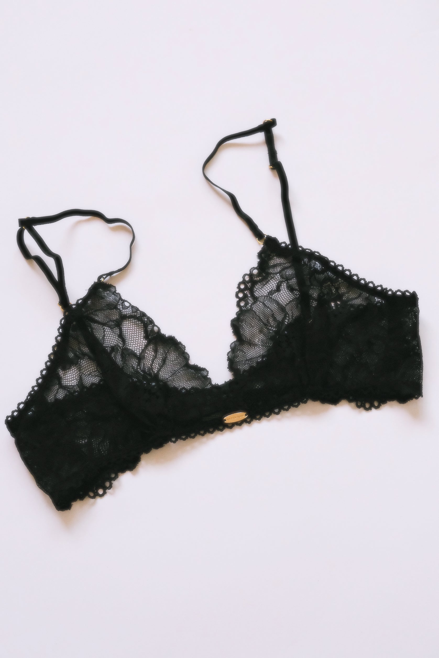 Mae is made from beautiful left over lace in a classic silhouette - adjustable shoulder straps for a personalised fit - fastens in the front - gold hardware and our the signature Nette Rose tag.