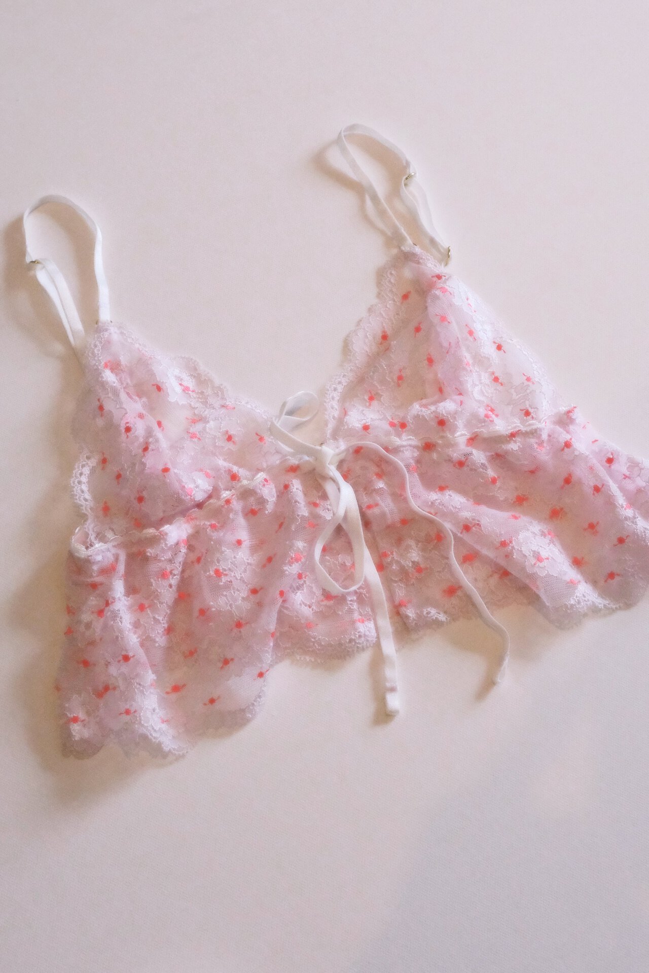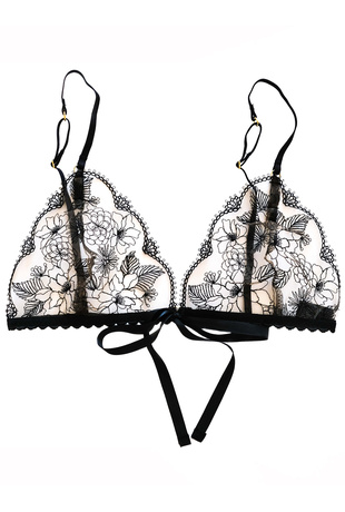 A classic triangle fit over your bust with a subtly frilly extended underbust which secures at the front with a gold hook and tie. She has adjustable shoulder straps for a personalised fit.