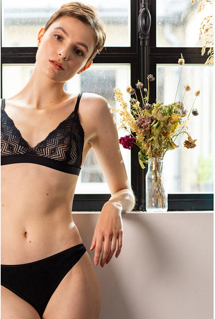 Deep black, lace in recycled fiber and without underwire, Dawa is the iconic lace triangle: the one that sublimates our chest without overdoing it, by a subtle play of geometric patterns and transparency. And as always, the dyes are free of harmful products.
