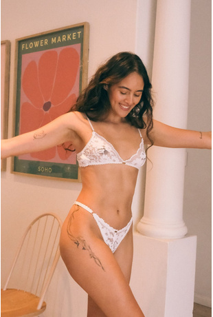 Our honey, Ellie is made with soft white floral stretch lace, paired with a cheeky back and finished with the signature Nette Rose tag. Adjustable side straps to move and groove with you.
