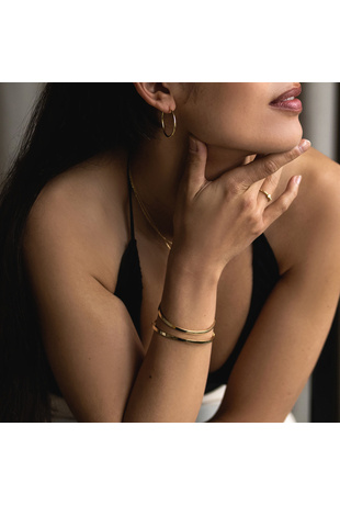 The Rectangle bangle is made of 14 karat solid gold. Compared to most other bangles which are hollow, this bangle is filled with silver. This way your bracelet will not get dents when you accidentally tap it agains a hard object. That's why the Rectangle bangle with silver core is much stronger than a hollow gold bangle bracelet and will therefore last a lifetime.