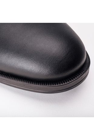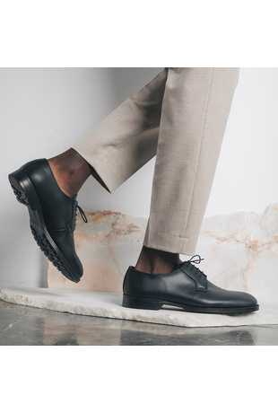 Shop Online Mikel Black Micro, the men's plain blucher made with Vegan Leather; a sustainable, innovative, cruelty-free, water-resistant, and durable material. With exposed sewn edges (and reinforcement all along the eyestay, near the laces), these shoes will bring a lasting and defined style. They have a traditional round-toe shape with solid pattern. They are a stylish and smart blucher for showing off a confident look.