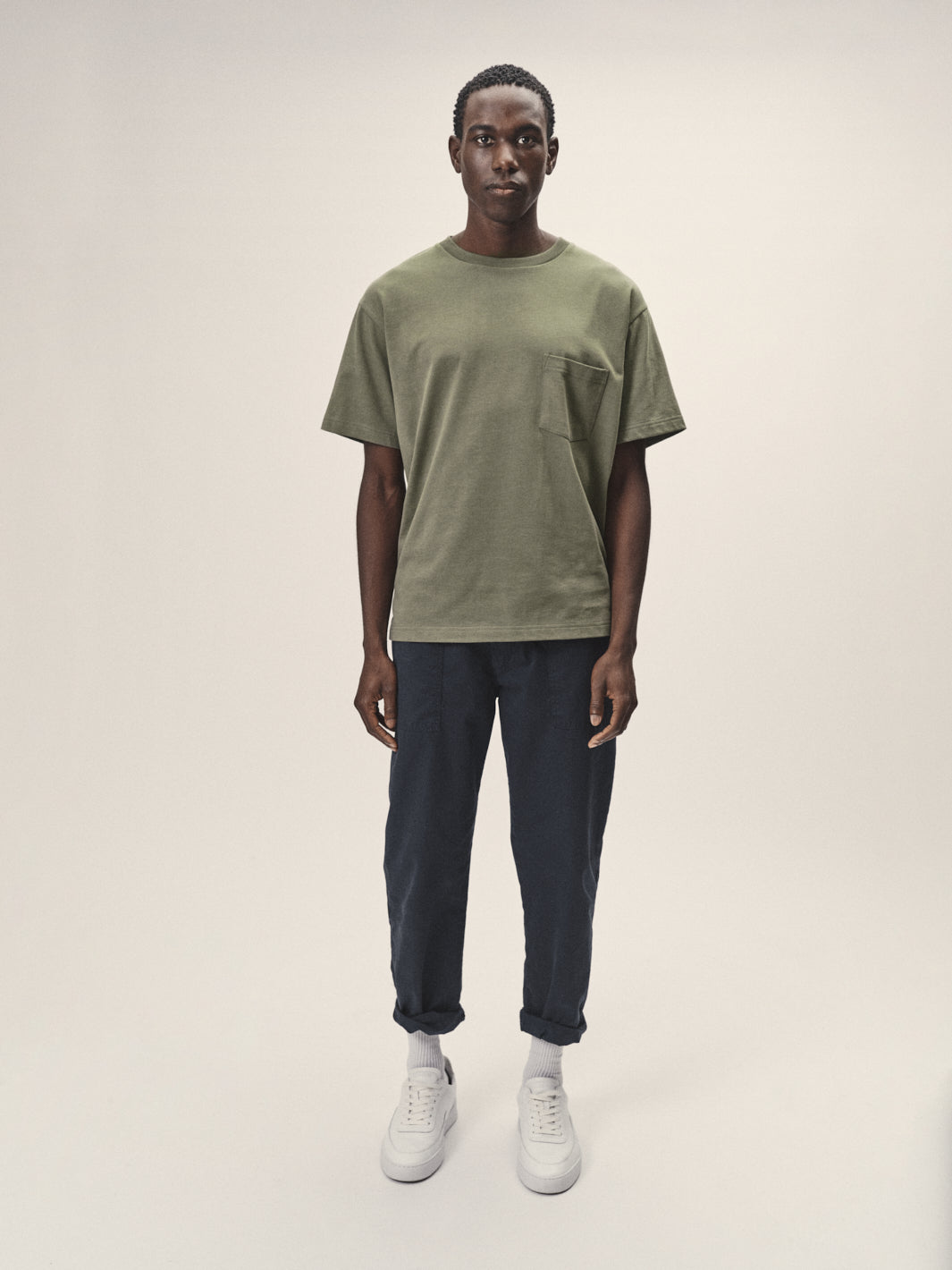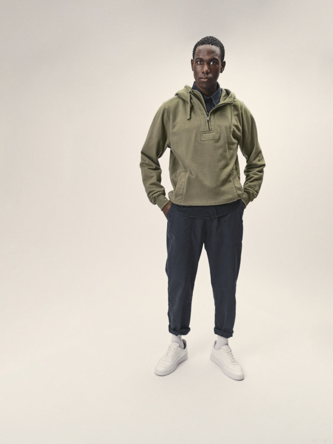 The worker style is made from a woven medium-weight organic cotton twill, and impresses with its fine diagonal structure.