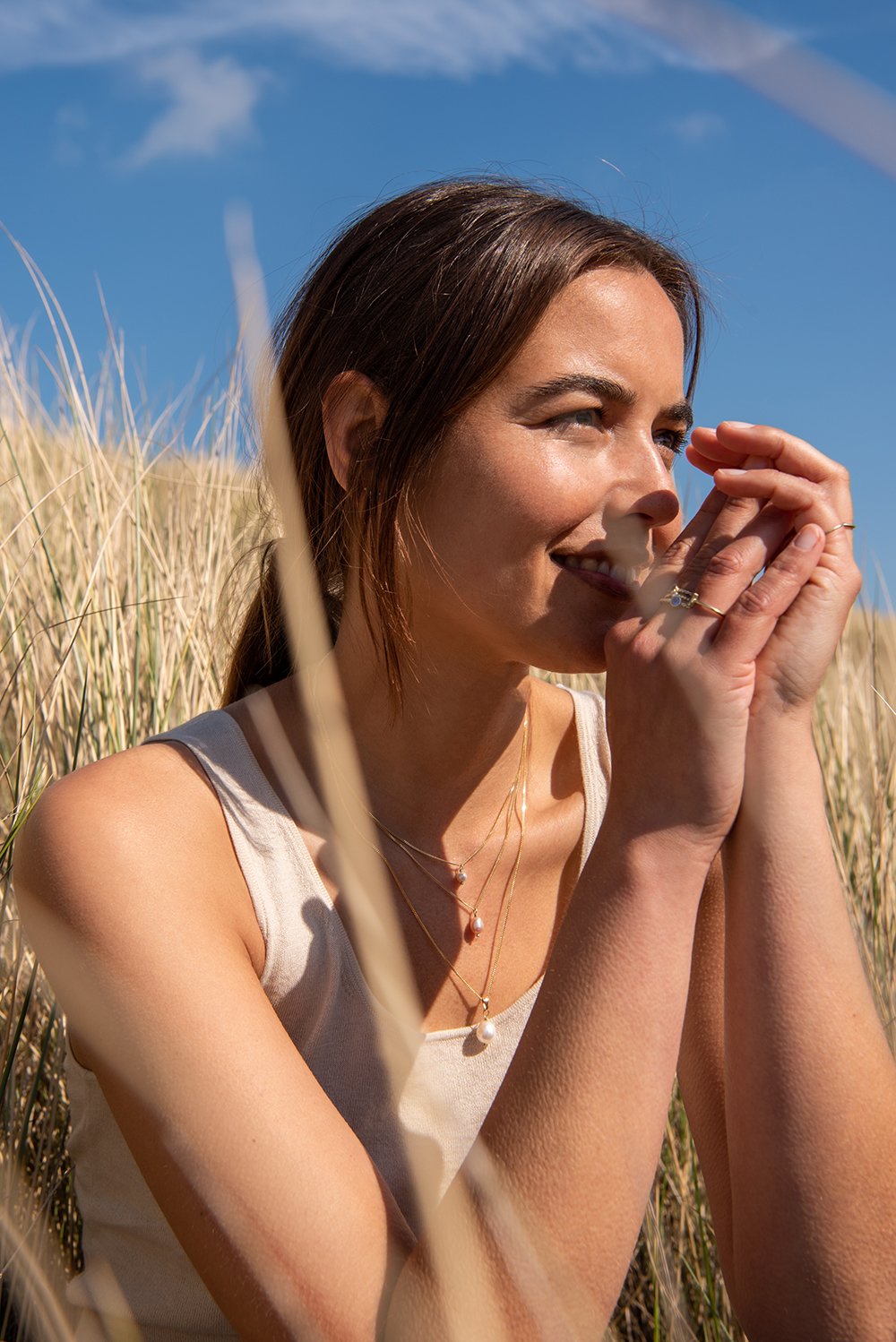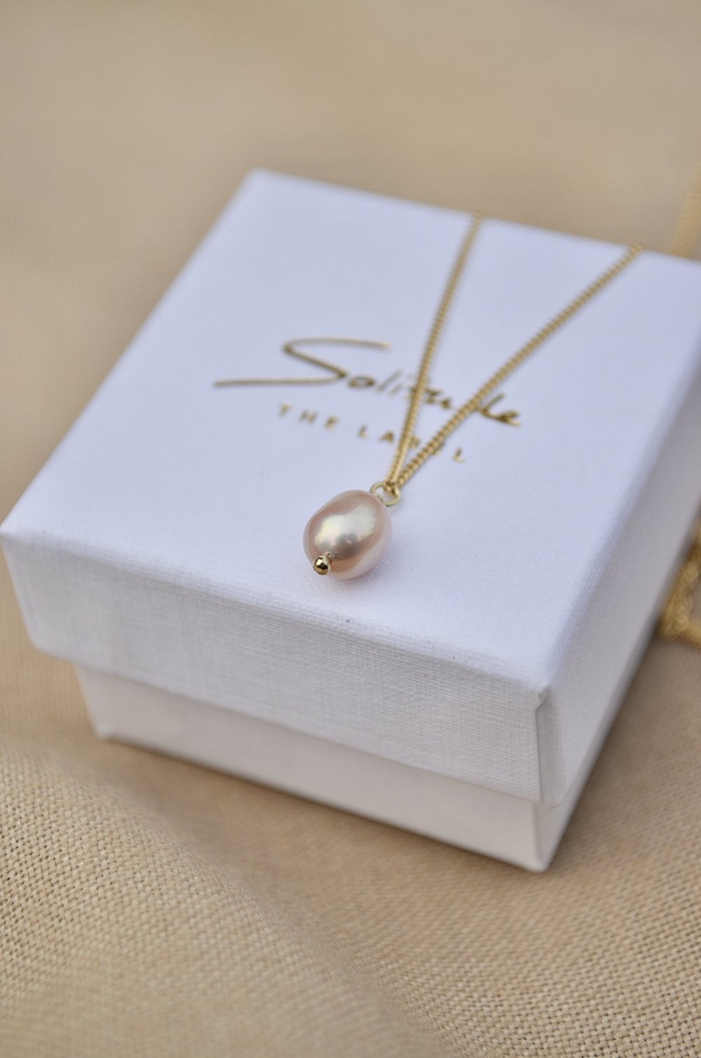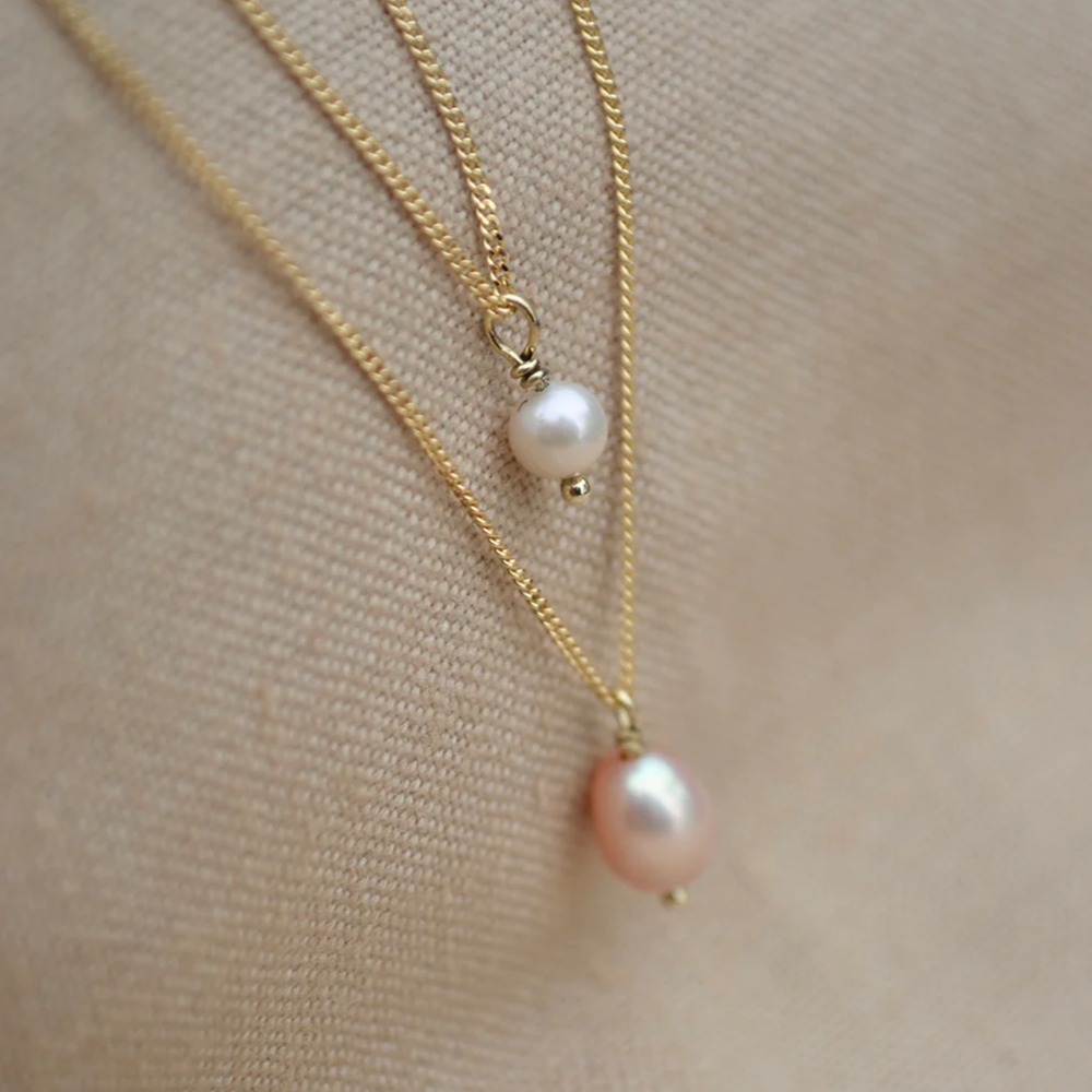 Do you want a round creamy-white pearl or an oval soft-pink one? The Tiny Pearl necklace consists of a 14K gold necklace with a freshwater pearl wrapped in 14K gold. Do you want to order the pendant only? That's possible!
